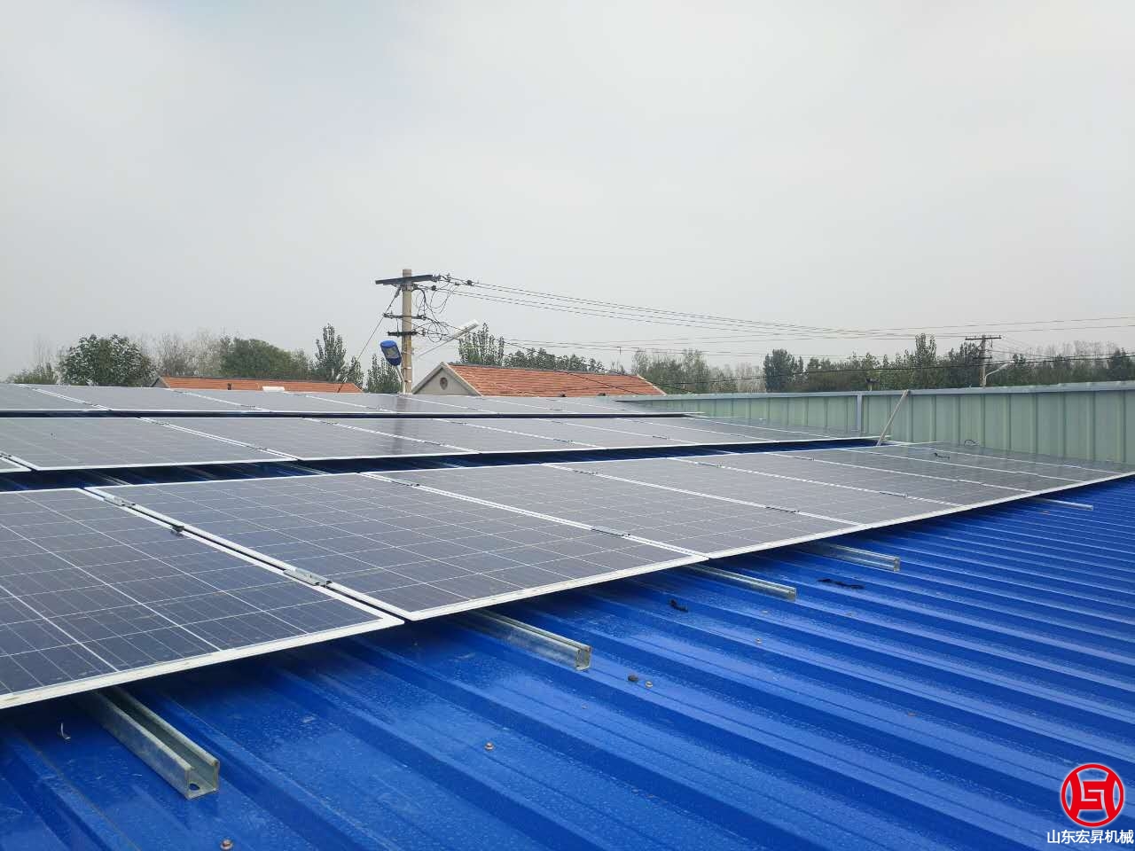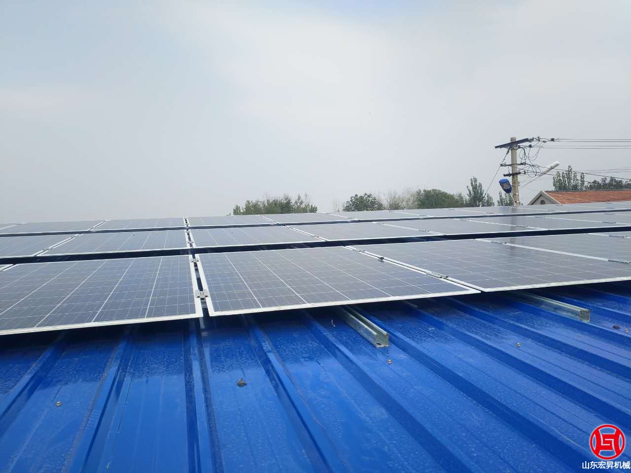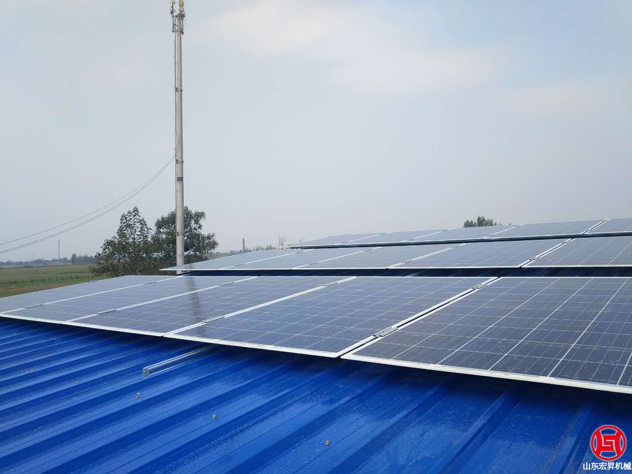 2016年10月,山東宏昇中標峽山區太保莊街道的扶貧項目,為某村搭建彩鋼瓦鋼結構大棚一個,10KW光伏發電系統一套,本系統采用265高效率A級雙玻組件,壽命可達30年。7oL山東宏昇機械科技有限公司