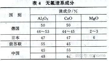 上述渣系均含有CaF2,據測試CaF270%+Al2O330%和CaF220%+Al2O340%+CaO40%的渣,氟的發散量分別為30~35mg/m3和12~18mg/m3。為了防止重熔中氟的揮發對環境的污染,近年來各國都致力于無氟渣的開發,無氟渣基本上采用CaO-Al2O3渣系,有時加入少量的MgO。(表4)這種渣系具有較低的電導率,在1600℃時,其電導率僅為CaF2-CaO-Al2O3渣的1/5,熔化速率可提高20%~40%,其生產率高,電0.耗低,而且無氟渣去氧、脫硫效果良好。但是無氟渣也存在著一些操作上的問題,如無氟渣熔點高,導電率低,引燃困難,需要液渣引燃;無氟渣的成分在CaO-Al2O3。共晶點附近,該共晶點液相線陡升,液渣成分稍有波動,渣熔點變化即很顯著,影響鑄錠成型,要求電渣輸入功率要穩定,工藝操作不如氟化物渣系易于控制;無氟渣的電導率低,重熔時需要較高的工作電壓,影響爐前操作的安全,需采用大充填比重熔;另外無氟渣CaO含量高易吸水增氫等。因此,雖然無氟渣在防止污染和提高電渣重熔熱效率方面具有突出的優越性,但仍處于試驗階段。