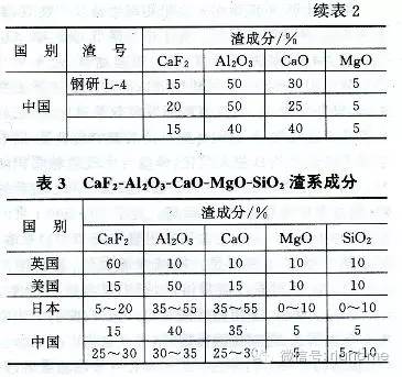 為了避免CaF2-Al2O3渣系的上述缺點,近年來開發了CaF2-CaO-Al2O3三元渣系,CaF2-CaO-Al2O3-MgO四元渣系及CaF2-CaO-Al2O3-MgO-SiO2五元渣系等(見表1~表3)。這些渣系的成分基本選擇在三元共晶線上,渣的熔點較低,渣皮凝固時偏析現象較輕微,渣成分穩定,鑄錠表面光潔,成型良好。而且這些渣系具有較低的電導率,提高了電效率,因渣中CaF2減少,造成的污染也有所減輕,渣中含少量MgO或SiO2,防止了鋼液吸氣,使鑄錠表面光潔。這些渣系的缺點是含有CaO,易于吸水,因此必須十分注意保持渣料的干燥,以防止鋼水吸氫增氧。