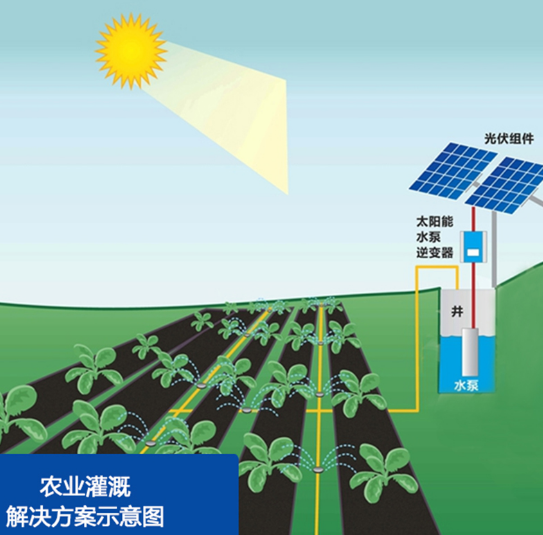 太陽能農業灌溉系統主要由水泵、太陽能水泵逆變器、光伏組件,及灌溉設備構成。該系統利用太陽能發電驅動水泵提水來替代傳統的柴油及市電灌溉系統。整套系統安裝方便可靠,節能環保、高效。可以應用在山區、村莊、農田、果園、花圃園林等。WvA山東宏昇機械科技有限公司