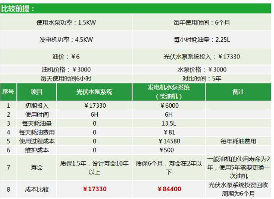1.5KW光伏水泵系統與同功率柴油水泵系統投資對比WvA山東宏昇機械科技有限公司